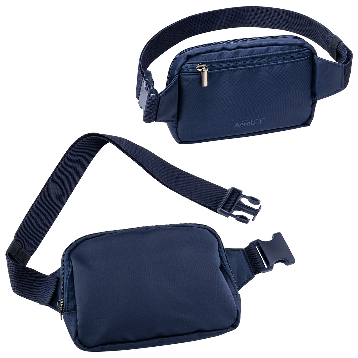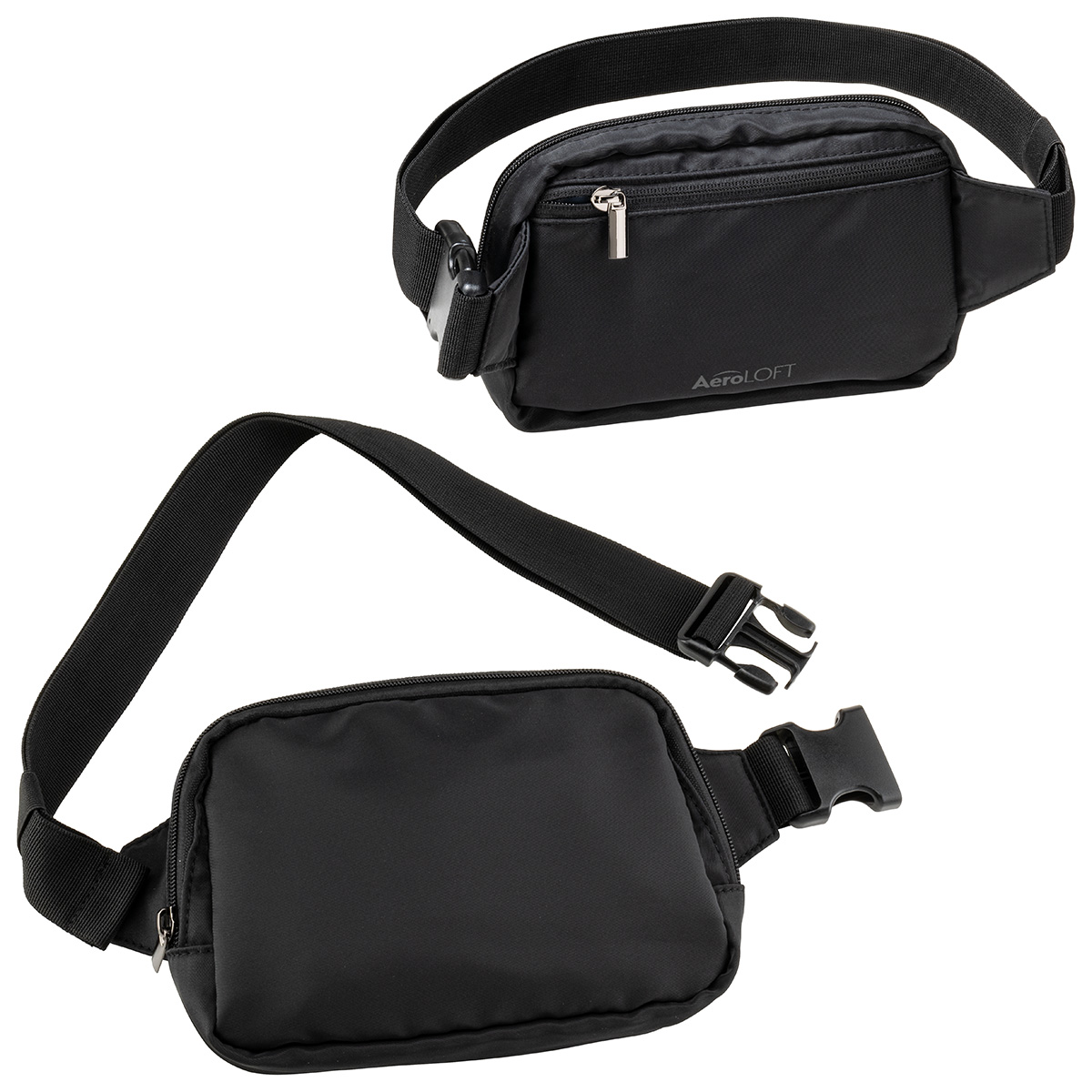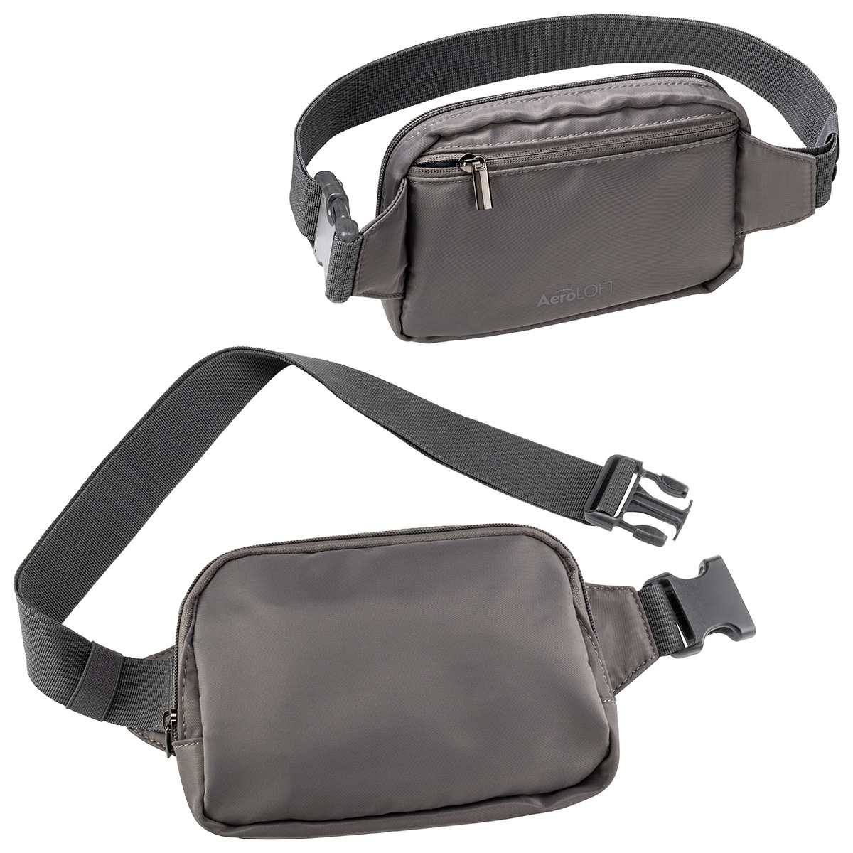 The AeroLOFT® Anywhere Belt Bag larger version of the original belt bag, a unisex, multi-functional bag designed for an active, on-the-go lifestyle. Constructed of water-resistant 290T polyester fabric, it features an easy-access zippered main compartment with 2 inside mesh pockets and a backside zippered side stash pocket. The sleek, compact design is perfect for phone, keys, and wallet, and can be worn as a cross-body, shoulder pack, fanny pack, or waist pack. Metallic grey performance polyester interior lining is water and puncture resistant. Contrast lining makes it brighter, easy to locate inside contents. Adjustable size belt strap with easy-snap buckle extends to 44″. Complies with Prop 65. 8.75″ L x 1.75″ W x 6.25″ H