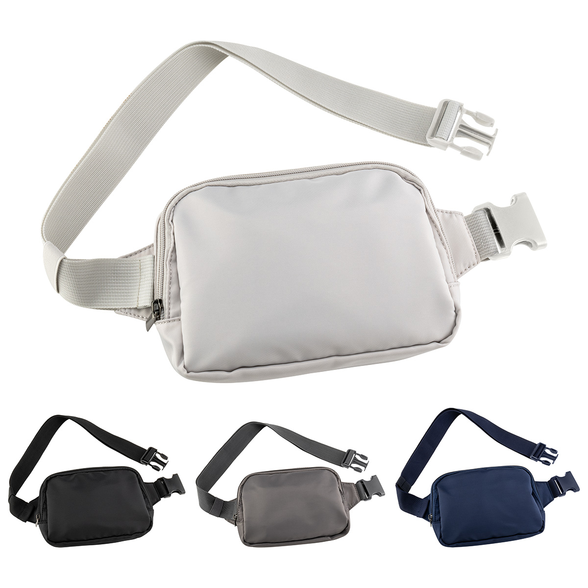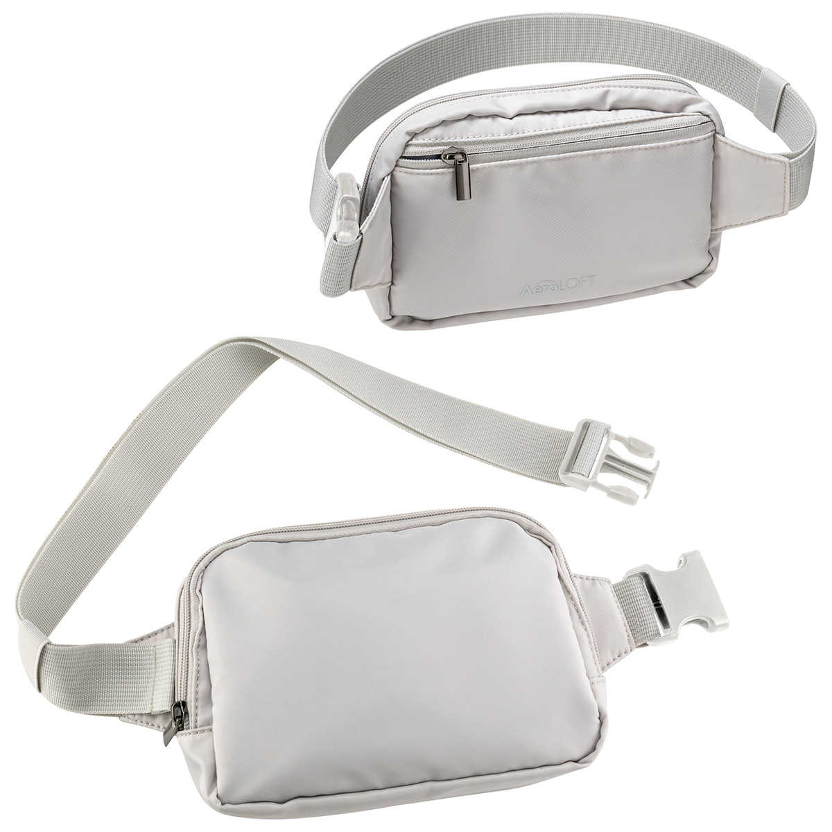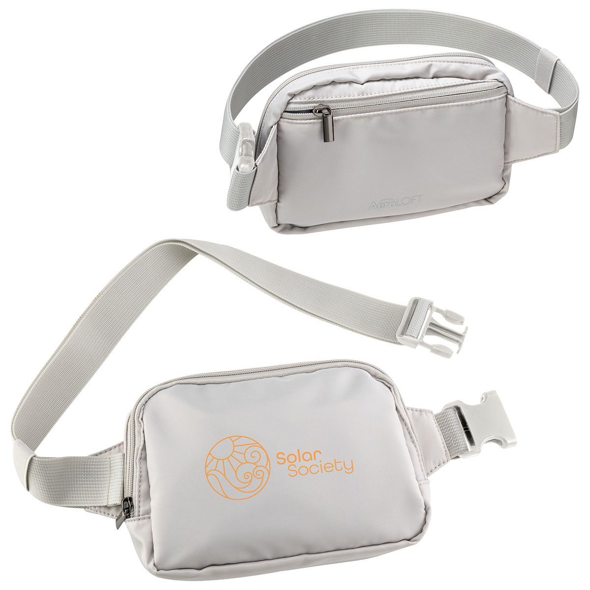 The AeroLOFT® Anywhere Belt Bag larger version of the original belt bag, a unisex, multi-functional bag designed for an active, on-the-go lifestyle. Constructed of water-resistant 290T polyester fabric, it features an easy-access zippered main compartment with 2 inside mesh pockets and a backside zippered side stash pocket. The sleek, compact design is perfect for phone, keys, and wallet, and can be worn as a cross-body, shoulder pack, fanny pack, or waist pack. Metallic grey performance polyester interior lining is water and puncture resistant. Contrast lining makes it brighter, easy to locate inside contents. Adjustable size belt strap with easy-snap buckle extends to 44″. Complies with Prop 65. 8.75″ L x 1.75″ W x 6.25″ H