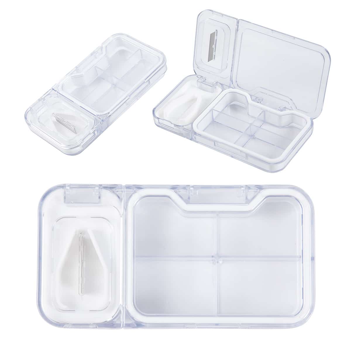 Organize your medication easily with our Cache 4-Compartment Pill Box with Tablet Cutter featuring 4 compartments and a safe blade that accurately cuts pills to your desired size for convenience! Complies with Prop 65. 4.75″ L x 0.75″ W x 2.5″ H