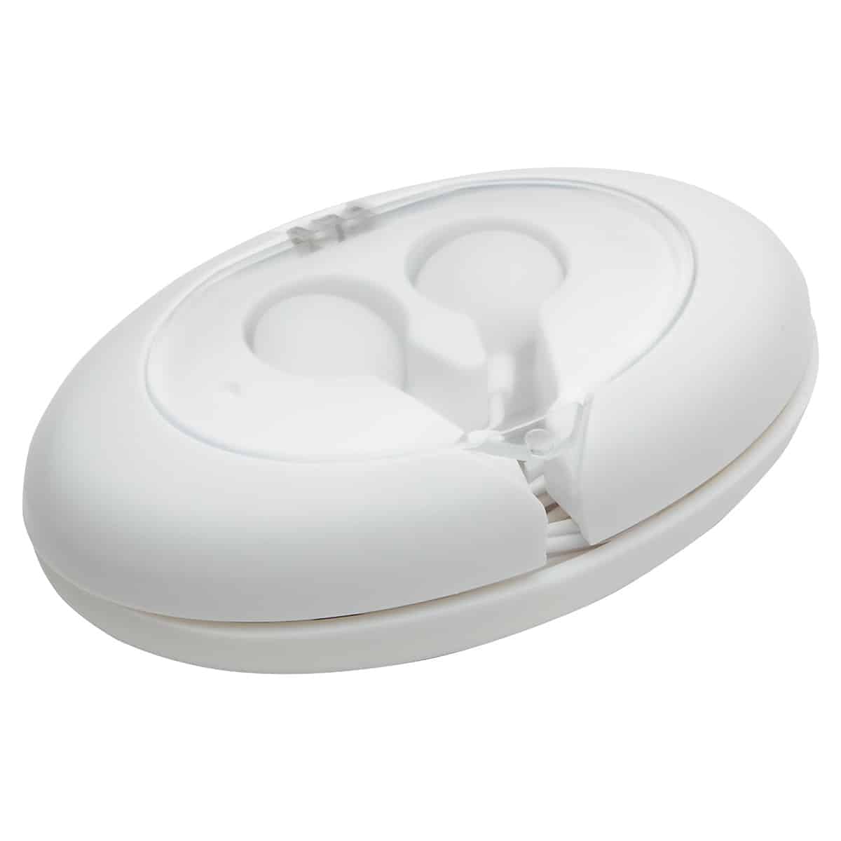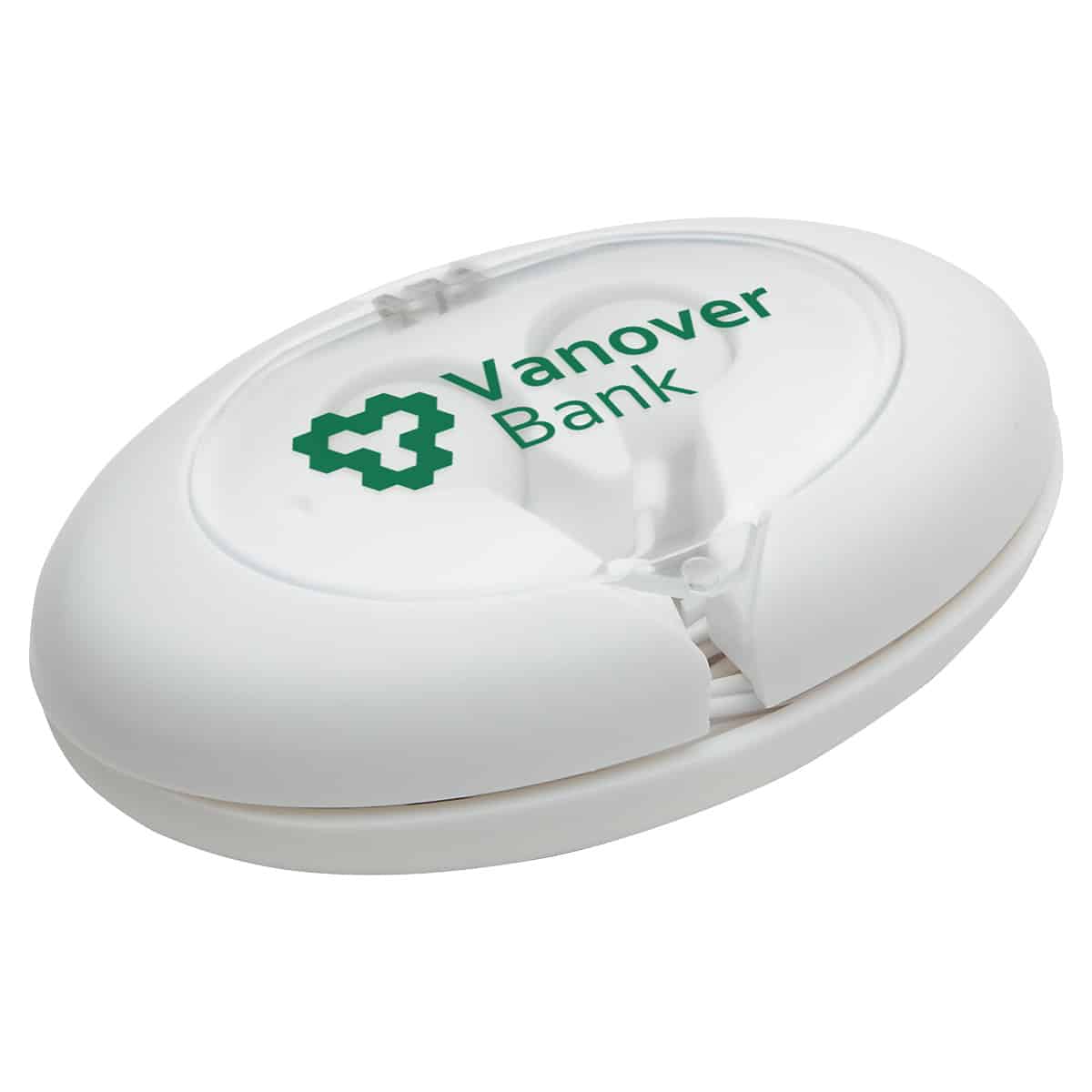 Comes in a tangle free case, Ear buds are held under flip open compartment, 48″ cord wraps under flexible rubber bottom compartment. Complies with Prop 65. 3.25″ L x 2″ W x 1.125″ H