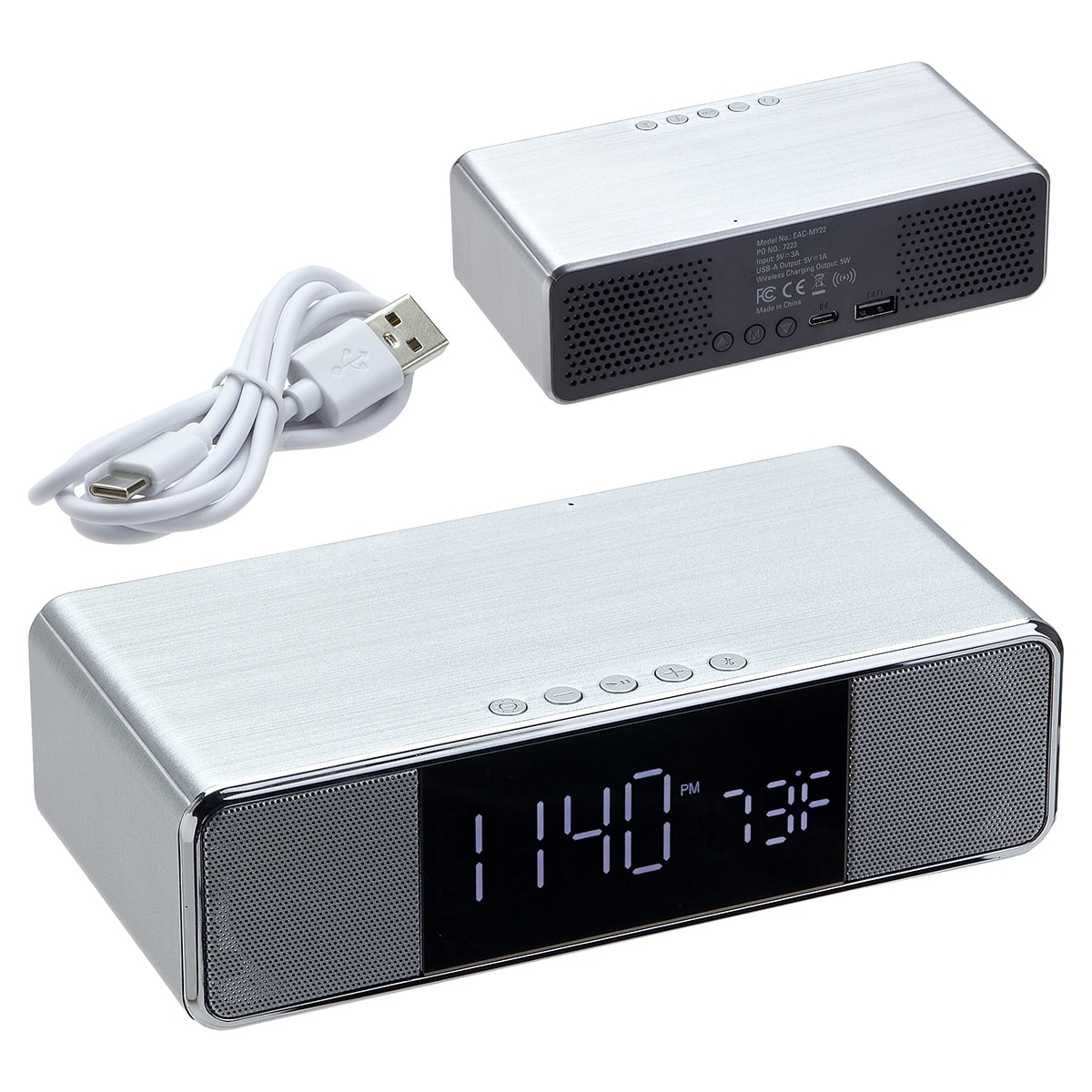 Mystic Alarm Clock with Wireless Speaker & Wireless Charger features dual 3W stereo wireless speaker. The charger is a 5W wireless charging pad and multi-function clock display with date, calendar, alarm, and temperature. Alarm clock display with backlight and multi-tone alarm with snooze option. Includes: USB Type-C cable, QI compatibility, Foreign Object Detection functionality and internal NTC temperature sensor protects charger from overheating. Output: 5V/1A & Input: 5V/3A. FCC Certified. Complies with OU, Prop 65. 6.375″ L x 3.125″ W x 1.875″ H