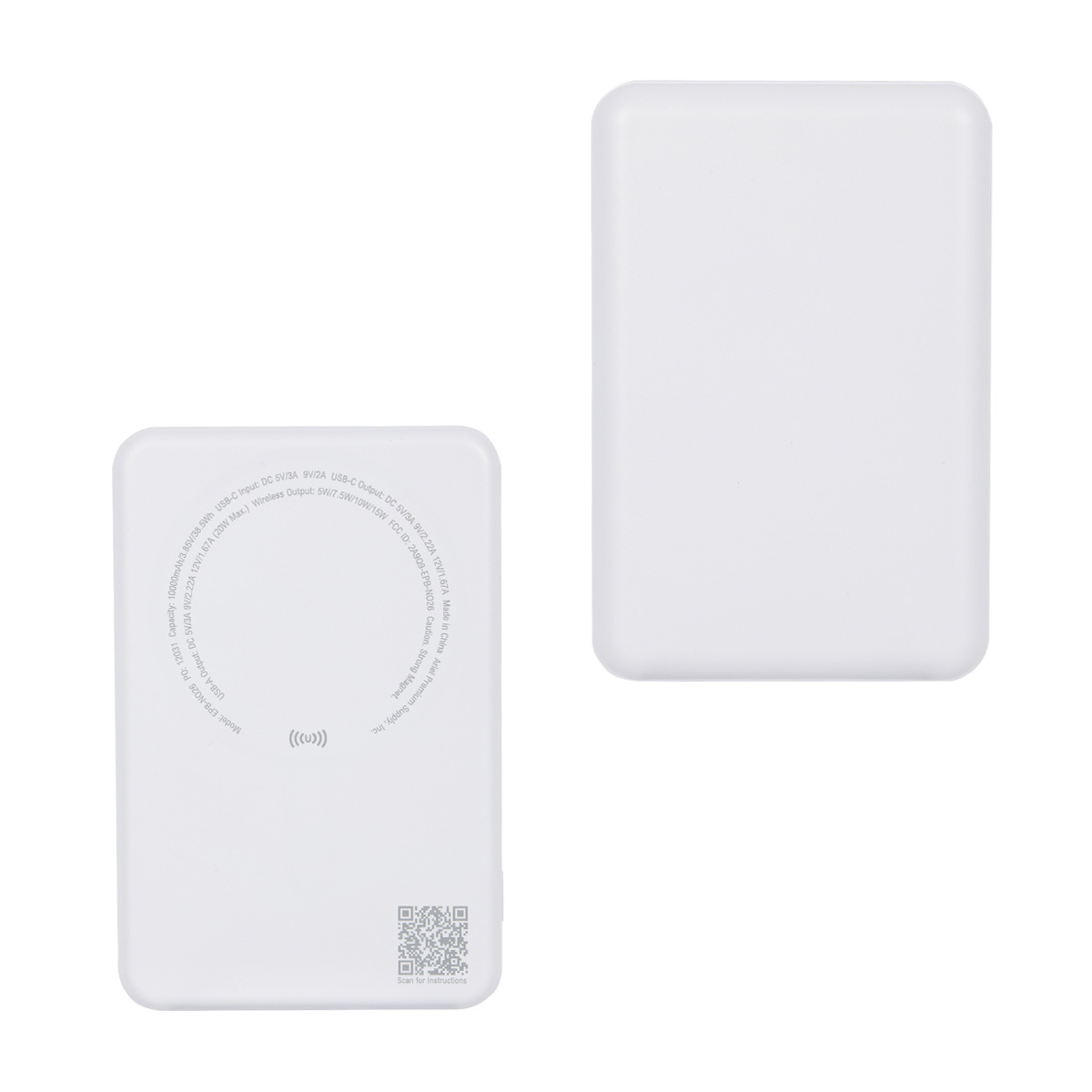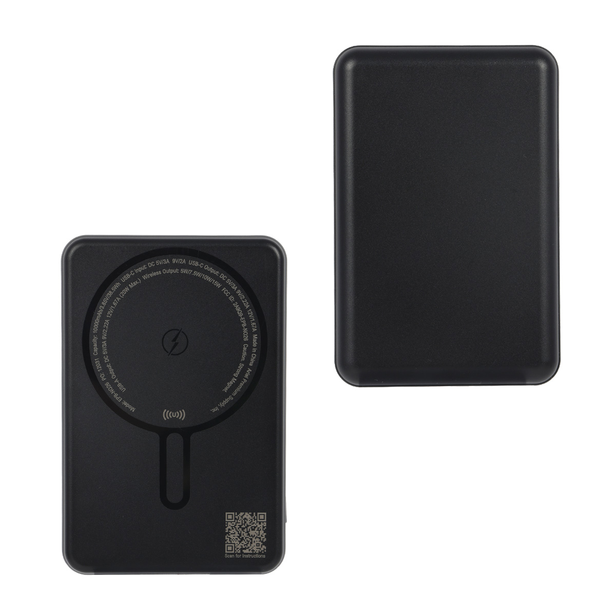 The Noble 10000mAh Power Bank combines portable backup power with fast, flexible charging. Featuring 20W PD output, a 15W magnetic wireless charger, USB-C input/output, and USB-A output, it supports both wired and wireless charging for compatible devices. Its compact, travel-friendly design makes it a convenient choice for commuting, events, daily use, and keeping devices powered on the go. A QR code is printed on each item providing access to the latest user manual. Complies with FCC, Prop 65, UN38.3. 2.625″ L x 0.75″ W x 4″ H