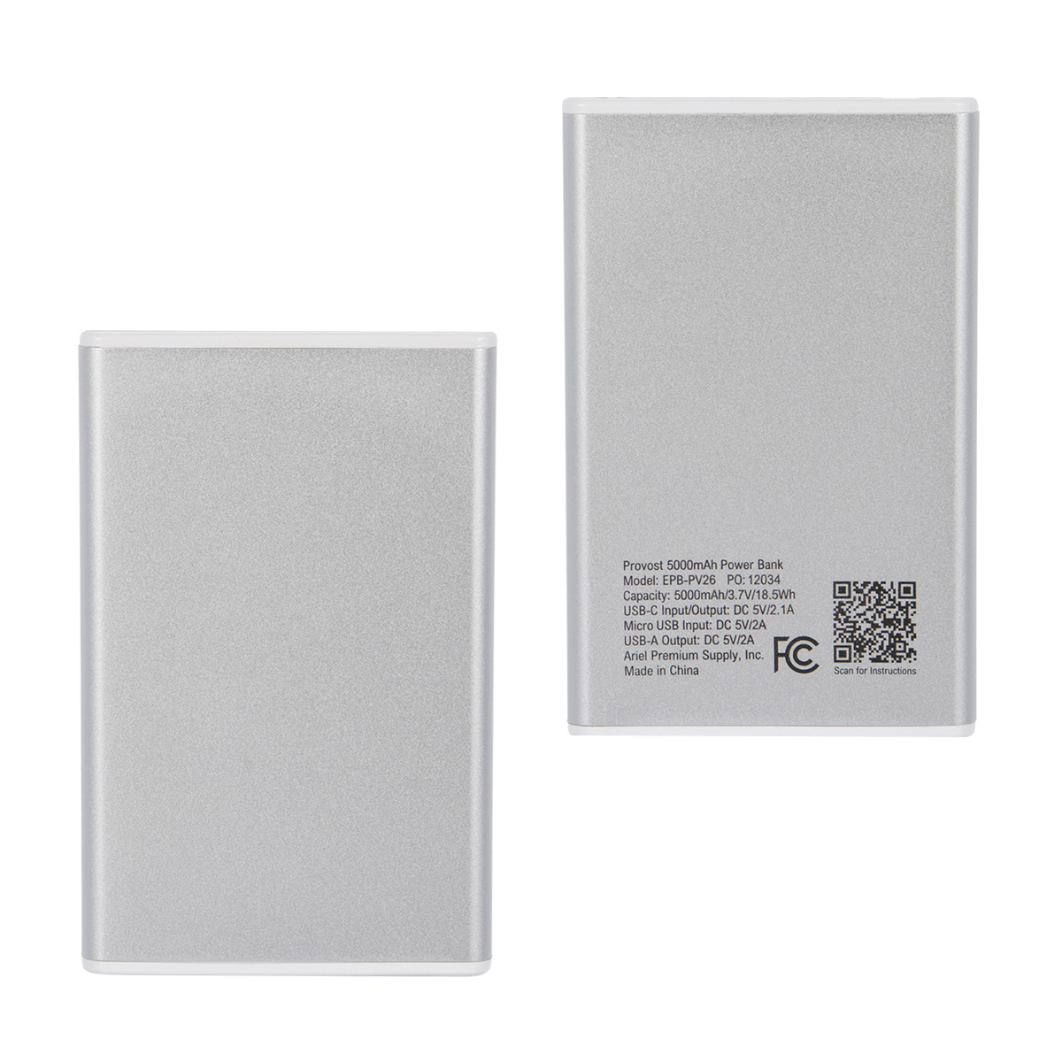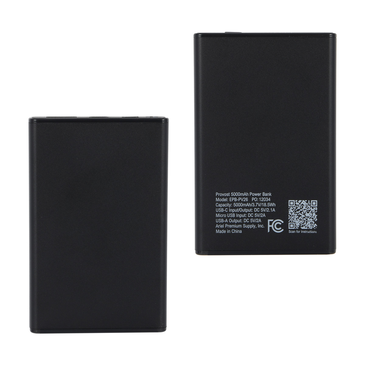 The Provost 5000mAh Aluminum Power Bank offers portable backup power in a slim, modern design. Its premium aluminum finish gives it an elevated look, while the compact size fits easily into pockets, bags, and travel kits. Featuring USB-C input/output, USB-A output, Micro USB input, and LED battery indicators, it is ideal for phones, earbuds, commuting, travel, events, and everyday use. A QR code is printed on each item providing access to the latest user manual. Complies with FCC, Prop 65, UN38.3. 3.625″ L x 0.5″ W x 2.375″ H