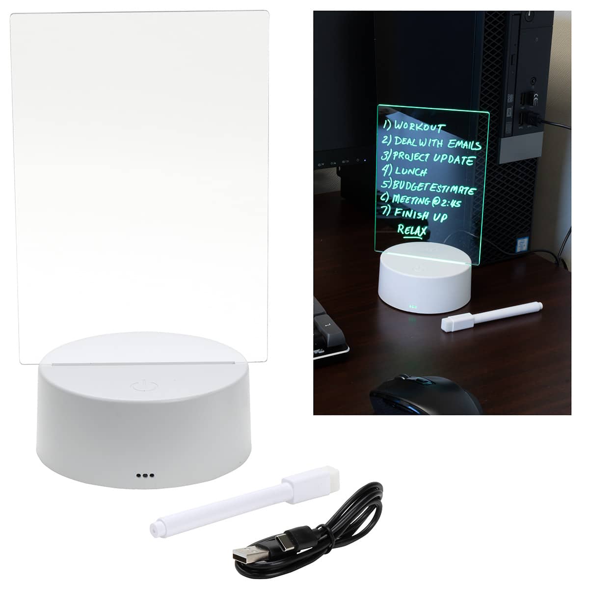 The Sprite Light-Up Writing Pad combines functionality and fun with its illuminated acrylic board and multi-color LED lights, offering a color-change mode for added creativity. The compact design features a 4-1/3″ x 6-1/4″ writing area and a 3-7/8″ diameter base. A QR code is printed on each item and/or gift box providing access to the latest user manual. Powered via USB or 3 AA batteries (not included), it includes a writing pen with an eraser and a 39-inch power cable. Perfect for home, office, or school use, it brightens up your notes and ideas. Complies with OU, Prop 65. 4.375″ L x 3.75″ W x 7.75″ H