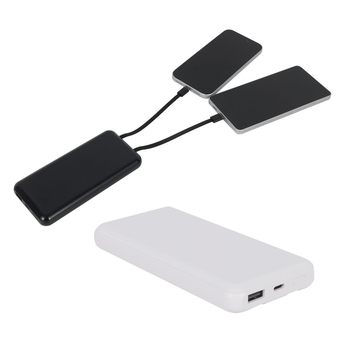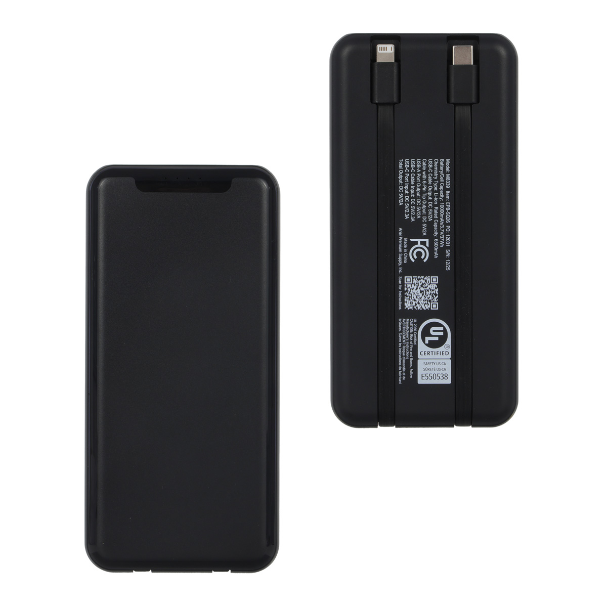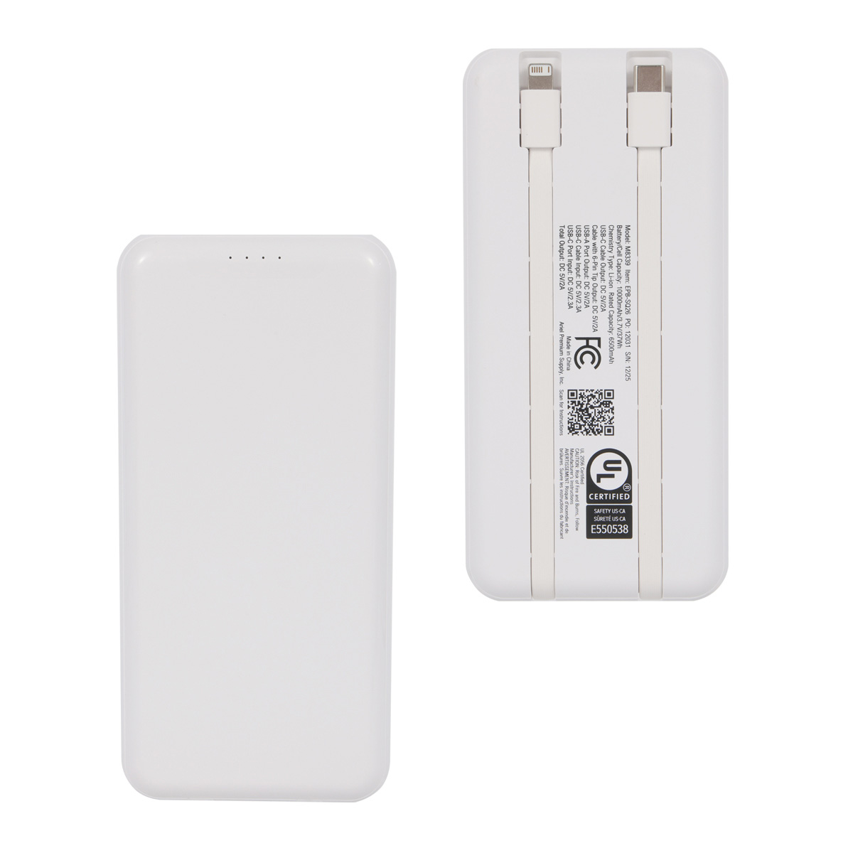 The Squire 10000mAh 20W PD UL Listed Power Bank with Built-In Charging Cables offers reliable backup power in a slim, portable design. It features integrated USB-C and Lightning cables, plus a USB-A output port for added charging flexibility. With up to 20W PD charging, LED battery indicators, and UL Listed certification for added safety, it is ideal for travel, commuting, events, employee gifts, and everyday use. A QR code is printed on each item providing access to the latest user manual. 5.625″ L x 0.625″ W x 2.625″ H