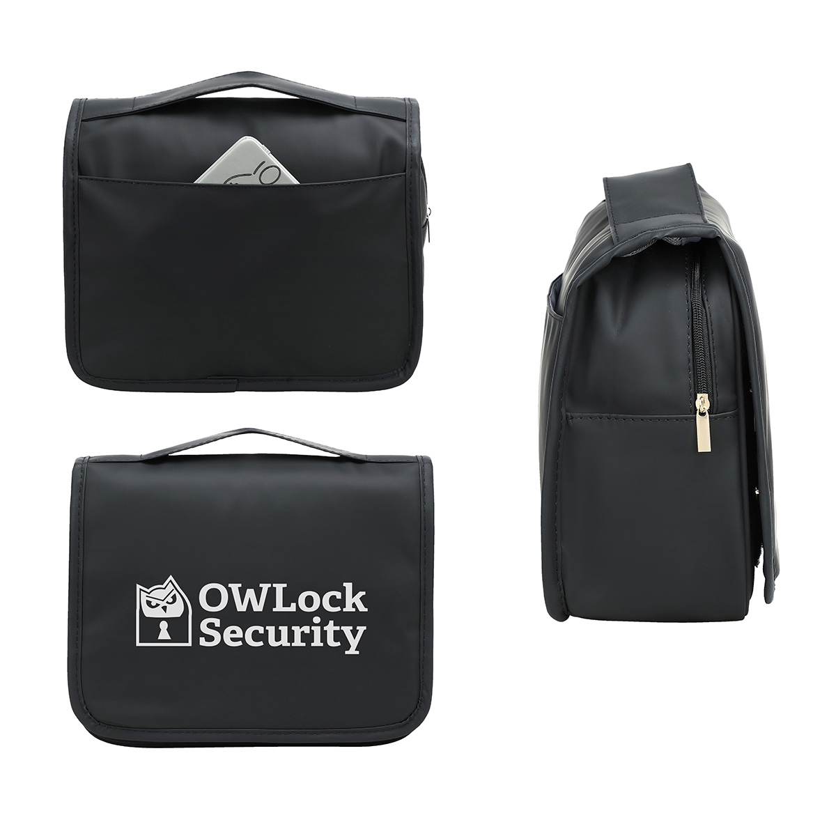 The Steward Soft Leatherette Toiletry Bag combines clean design with everyday functionality for travel or home use. Made from updated waterproof leatherette, it features a structured shape, wide zip opening, and multiple interior mesh pockets to keep toiletries organized and secure. An internal bottle pocket helps prevent spills, while the built-in hanging hook allows easy access in bathrooms or locker rooms. Finished with a top carry handle, it’s ideal for travel, gym visits, or overnight stays. Complies with Prop 65. 9.5″ L x 1.75″ W x 8″ H