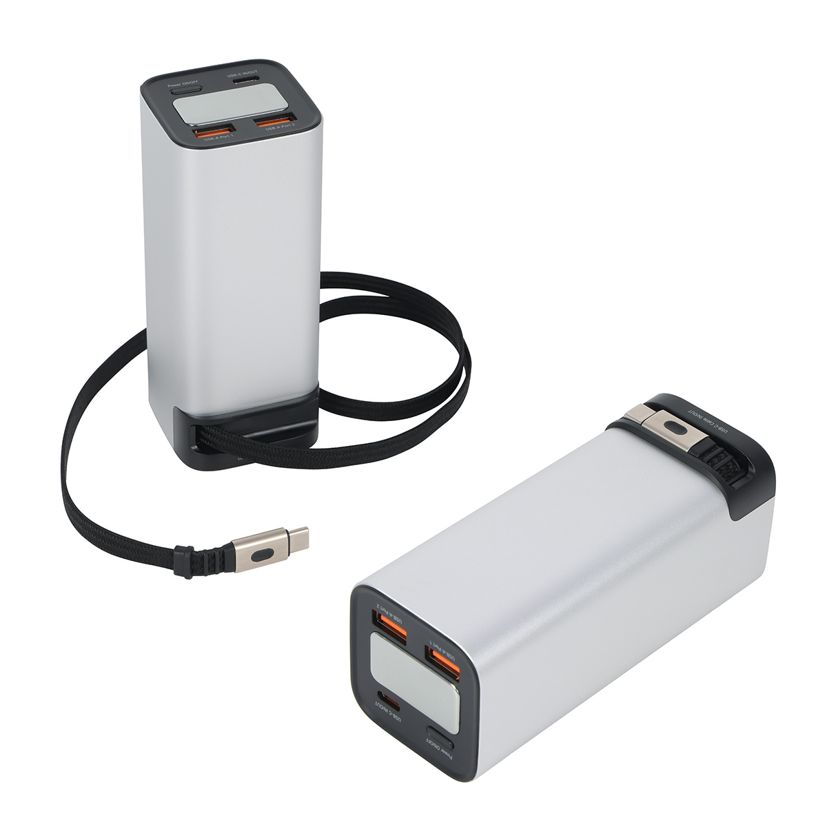 The Ultimate 20000mAh 100W PD Power Bank delivers high-capacity backup power for laptops, tablets, phones, and more. Featuring a built-in retractable USB-C cable, up to 100W USB-C PD output, dual USB-A ports, and a digital battery display, it can charge up to four devices at once. Its sleek aluminum-look finish and compact design make it ideal for travel, commuting, work, and everyday use. A QR code is printed on each item providing access to the latest user manual. Complies with FCC, Prop 65, UN38.3. 4.75″ L x 2″ W x 2″ H